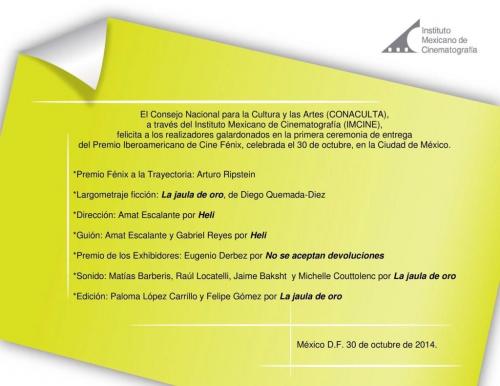 Entre la calidez que destaca a los latinos, se celebró la primera entrega de los "Premios Fénix", al cine iberoamericano, celebrados en el Teatro de la Ciudad de México "Esperanza Iris", el 30 de octubre de 2014.