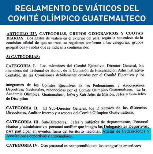 El Reglamento que establece los criterios para otorgar viáticos y gastos de bolsillo a los deportistas que representan a Guatemala en las diferentes competencias internacionales y eventos del ciclo olímpico, data del año 2011. Se trata de una de las normativas que evidencia cómo los deportistas no son considerados los sujetos principales de la actividad deportiva y de la inversión de los recursos del Estado.