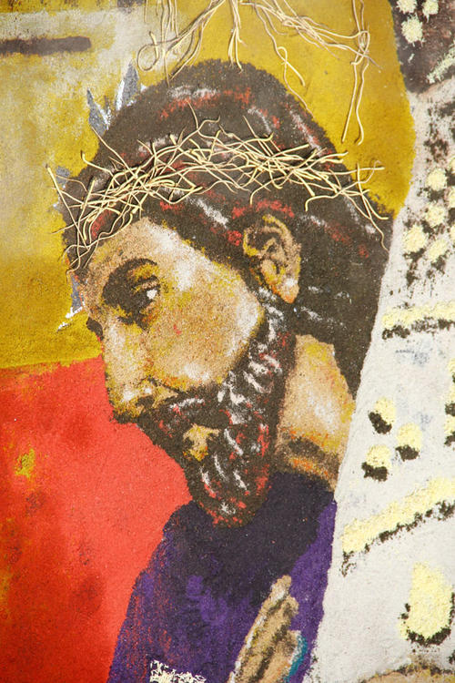 Una impresionante alfombra adornó este Martes Santo el paso de la Procesión de la Reseña, de Jesús Nazareno de la Merced, y para la cual se requirieron más de 12 horas de trabajo y una técnica de pintado especial.