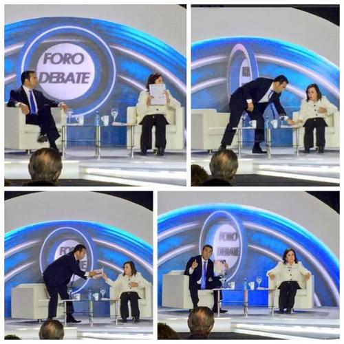 En una de las acusaciones, Sandra Torres justificó su razonamiento con lo publicado en un artículo de la revista Contrapoder. En ese momento, el candidato de FCN Nación se levantó de su asiento y cuando Torres ponía la revista sobre la mesa, le arrebató la publicación de la mano.