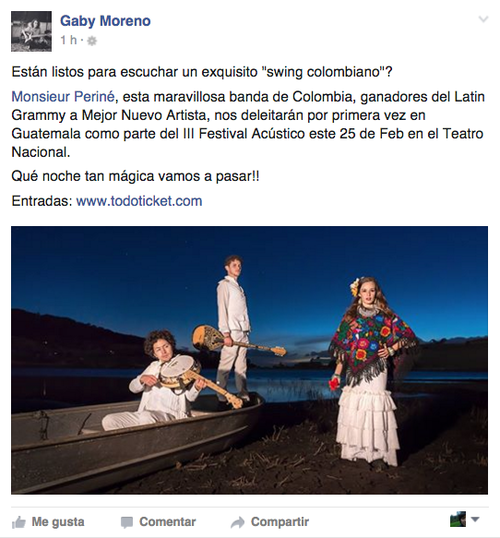 La agrupación colombiana Monsieur Periné es parte de los invitados al III Festival Acústico de Gaby Moreno, que se celebrará el 25 de febrero de 2016, en la Gran Sala Efraín Recinos del Centro Cultural Miguel Ángel Asturias.