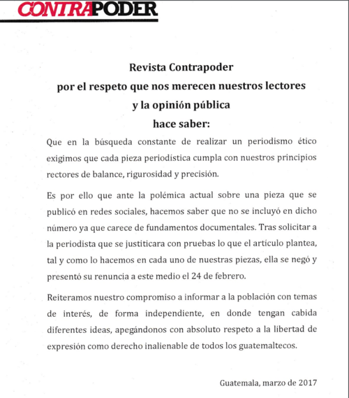 La justificación que usó Solares Archila fue que el reportaje "no tenía el rigor periodístico" para ser publicada. Le pidieron a la editora de la revista, Jessica García, que les compartiera la posible portada a los directivos y en ese momento sugirieron que se cambiara con un tema de personas con capacidades diferentes. Esta fue la razón que las movió a renunciar.