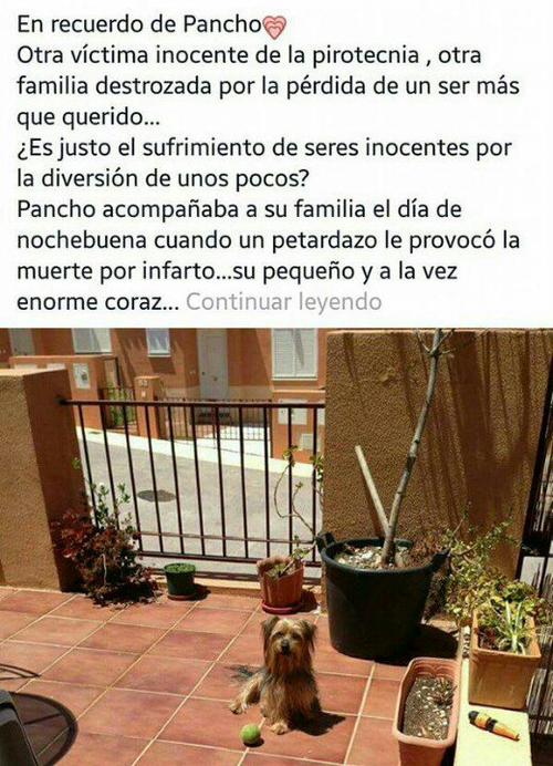La dueña del perro ha compartido en su cuenta de Facebook una frase en honor a su fiel compañero: “otra victima inocente de la pirotecnia, otra familia destrozada por la pérdida de un ser más que querido …”.