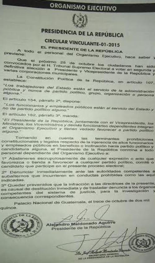 Este jueves fue publicada una circular vinculante en el Diario Oficial en la que el presidente de la República, Alejandro Maldonado, advierte a trabajadores del Estado que habrán sanciones para aquellos empleados que beneficien o se inclinen con algún partido político o candidatura durante la segunda vuelta de las Elecciones 2015.