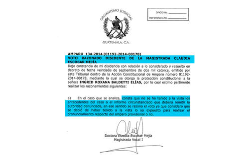 Escobar es la magistrada de la Sala Quinta de Apelaciones del Ramo Civil que razonó su voto en la resolución que dejó en suspenso provisional la sanción del Tribunal Supremo Electoral (TSE), con la que había suspendido a Roxana Baldetti como Secretaria General del Partido Patriota (PP).