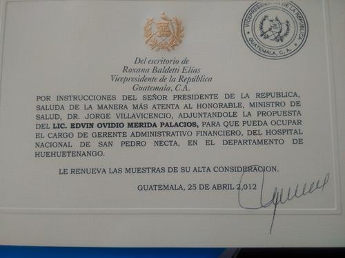 El nuevo titular del Ministerio de Salud Pública y Asistencia Social (MSPAS), Mariano Rayo, reveló que los cargos eran asignados a través de cartas firmadas por la exvicepresidenta Roxana Baldetti y el expresidente Otto Pérez Molina. Para probarlo, ofreció fotografías de algunos documentos donde Baldetti solicita la contratación para personal de salud en el departamento de Huehuetenango.