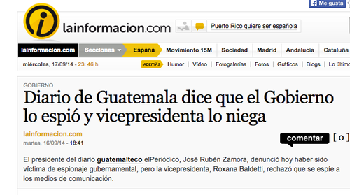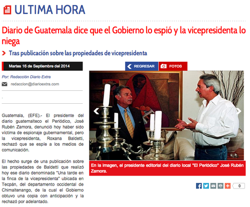 Este miércoles el Gobierno guatemalteco ha dado de qué hablar a nivel internacional, pero no por haber acabado con la desigualdad, el analfabetismo, la violencia y el hambre o por su transparencia en la gestión pública. Hoy, los medios internacionales reproducen cables de agencias que informan sobre la denuncia de espionaje gubernamental a los medios de comunicación.