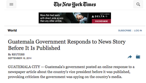 El prestigioso y popular diario New York Times publicó este miércoles el artículo titulado "El gobierno guatemalteco responde a una historia periodística antes de ser publicada", en la que cuenta sobre el comunicado divulgado en el sitio de internet gubernamental en la que responde a la publicación un día antes de que fuera impresa.