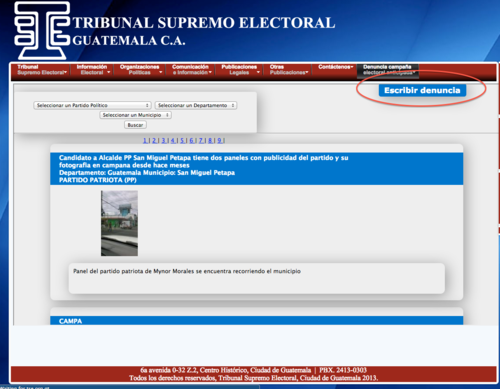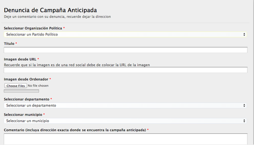 3. Llena el formulario que consta de siete campos: nombre del partido político, el título que se desee colocar a la denuncia, agregar la imagen de lo denunciado, seleccionar el departamento y el municipio donde se encuentre la falta, colocar un comentario o descripción y listo. Usted da clic en enviar y la denuncia ya aparecerá en el mapa virtual que tiene el TSE para dar seguimiento a las denuncias por campaña anticipada de cada partido.