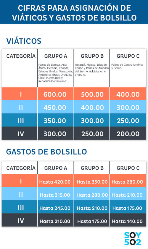 Otra tabla establece grupos los montos diarios de viáticos, de acuerdo con el destino del viaje o la participación. El Grupo A calcula los montos para países de Europa, Asia, África y Oceanía, y algunos países de América. El Grupo B contempla viajes al Caribe y América del Sur y Panamá, y el Grupo C abarca al resto de países de Centroamérica.