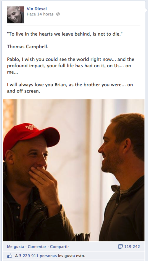 Además, el actor también recordó a Paul Walker en su página oficial de Facebook colgando una foto de ambos con el siguiente mensaje: