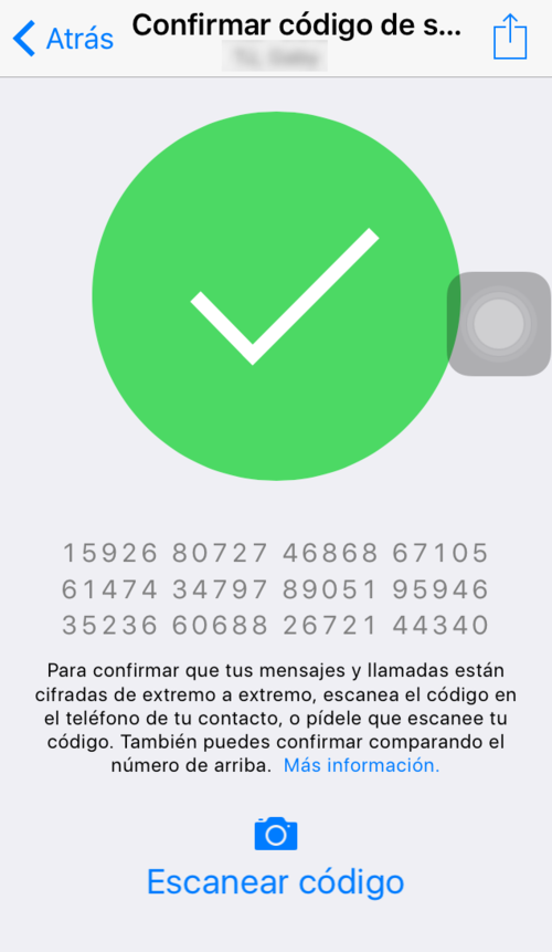 La seguridad se activa escaneando el código QR. Para llegar a esta opción sólo hay que pulsar sobre el nombre de tu contacto en la conversación y ver si la opción de cifrado está activada o no. Si lo está solo tienes que escanear el código QR en el teléfono de tu contacto para confirmar.