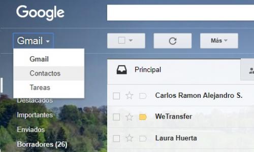 Los contactos guardados en los dispositivos con este sistema operativo estarán asociados a tu cuenta de Google, por lo que Gmail será la vía para recuperarlos. Una vez dentro de tu correo electrónico, busca en la parte superior izquierda la opción “Gmail” y selecciona la pestaña “Contactos”.