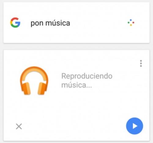El comando reproducir música se interpreta automáticamente como el comando “Voy a tener suerte” de Google Play Music, y salta a una lista de reproducción creada por el sistema en base a lo que has escuchado anteriormente. Puedes decirle a Google también “Reproducir música en...” y después seleccionar la app en cuestión pero la reproducción no arranca automáticamente.