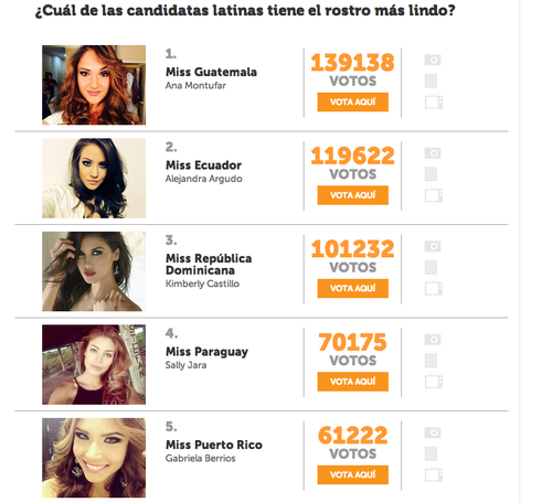 La cadena de televisión Telemundo ha lanzado un concurso para que los usuarios voten por la candidata latina con el rostro más lindo. Hasta el momento la guatemalteca lidera el ranking de la votación.
