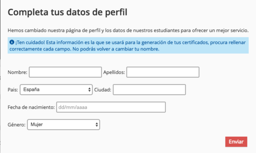 Luego de registrarte con tu correo tendrás que llenar tus datos del perfil. Ten en cuenta que debe ser la información correcta porque es la que aparecerá en tu certificado.