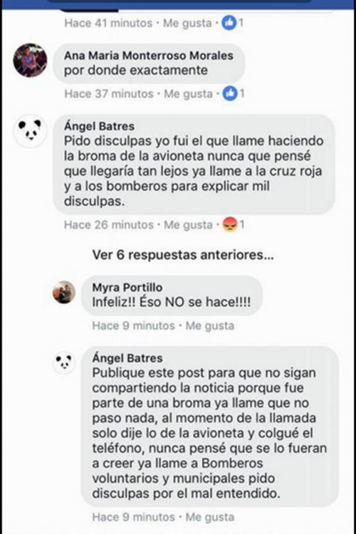 Tanto la CRG como los Bomberos Voluntarios confirmaron que la llamada fue falsa, puesto que en el área no localizaron aeronave y los registros de sus centros de operaciones revelan que el hombre solo alertó del accidente y colgó el teléfono.