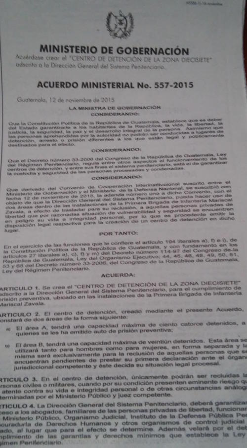 Este lunes fue publicado en el Diario Oficial un Acuerdo Ministerial que anuncia la creación del "Centro de Detención de la Zona Diecisiete" ubicado en las instalaciones de la Primera Brigada de Infantería Mariscal Zavala, en el que guardarán prisión hombres y mujeres.