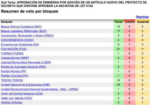 Este artículo contó con el respaldo de casi todas las bancadas, a excepción de Winaq que no estuvo presente y Encuentro por Guatemala (EG) que se opuso.