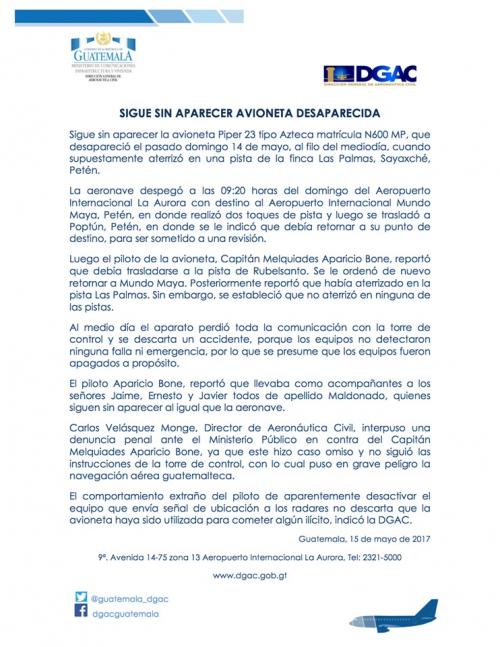 La DGAC no ha confirmado qué o quién obligó al piloto a modificar su plan de vuelo. Tampoco se conoce la ubicación de la aeronave ni de los pasajeros guatemaltecos identificados como Jaime, Ernesto y Javier Maldonado.