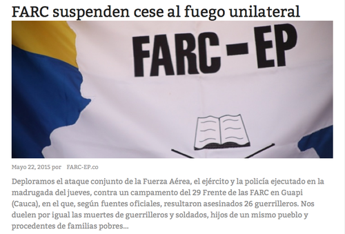 "No estaba en nuestra perspectiva la suspensión de la determinación del cese al fuego unilateral e indefinido proclamado (...), pero la incoherencia del gobierno Santos lo ha logrado, luego de 5 meses de ofensivas terrestres y aéreas contra nuestras estructuras en todo el país", indicó la guerrilla.