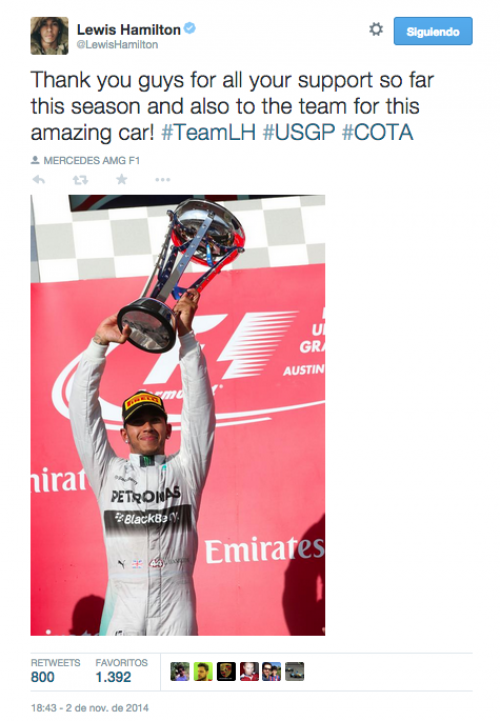 El inglés, que este domingo igualó los 32 triunfos de Alonso en Fórmula Uno -la quinta mejor marca de la historia-, lidera ahora el campeonato con 316 puntos, 24 más que su antagonista alemán, a falta de las dos últimas carreras, la del próximo fin de semana, en Brasil; y la que decidirá el Mundial, con puntuación doble, el próximo 23 de noviembre, en Abu Dhabi. Los dos Williams del brasileño Felipe Massa y el finlandés Valtteri Bottas concluyeron en la cuarta y la quinta posición, por delante de Fernando Alonso (Ferrari).