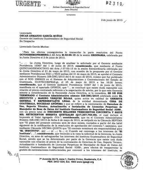 Un oficio subido a Guatecompras con fecha de 2 de junio, señala que la Junta Directiva del IGSS encontró dudas razonables en los precios contratados con dicha empresa, por lo que se tomó la decisión.