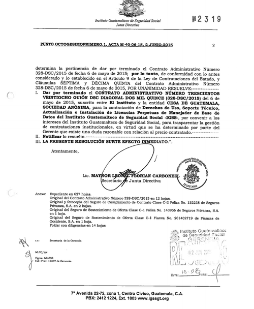 Sin embargo, el contrato suscrito con la empresa Intellego, S.C., continúa vigente, pese a que ya tiene una denuncia penal en contra de la Junta Directiva del IGSS que avaló la adquisición de software SAP en un número indeterminado de computadoras en el Seguro Social.