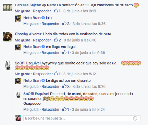 El jefe edil trata de responder a todos los comentarios que puede y asegura que lo hace el personalmente y no ninguno de sus asistentes. Entre los mensajes que recibe muchos son agradecimientos por el trabajo que realiza, pero además recibe varios piropos a los que Neto Bran contesta con un simple “jejeje, bendiciones”.