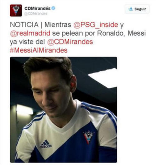 Lo más gracioso es que el Messi adulto aparece con un uniforme azul y blanco, muy parecido al del Club Deportivo Mirandés de una de las ligas españolas, por lo que el equipo aprovechó a tomar un fotograma del video y modificarlo, colocándole su escudo al uniforme y escribiendo este tuit: "Mientras PSG y Real Madrid se pelean por Cristiano Ronaldo, Messi ya viste del Mirandés".