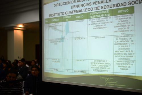 En total, todo el informe demuestra que se presentaron 97 denuncias penales Ministerio Público (MP) en contra de funcionarios públicos por irregularidades en su ejecución presupuestaria por un monto que sobrepasa los 472.3 millones de quetzales.