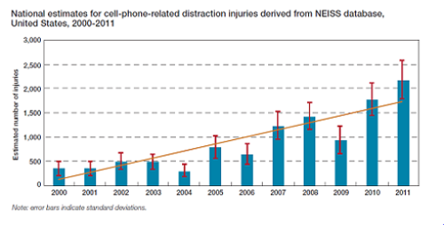 Según un informe realizado por la Universidad Estatal de Ohio en 2013, en el 2010 más de 1 mil 500 personas fueron atendidas en centros asistenciales a consecuencia de lesiones ocasionadas por andar distraído con el celular por la calle, cifra que a la fecha se ha multiplicado por seis. Lo más habitual son tropezones, cruzar con el semáforo en rojo o choques con postes y señalizaciones en las banquetas.