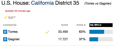 Torres superó un 60% de los votos de su distrito contra 40% de su contrincante, también demócrata, Christina Gagnier.