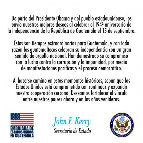 Por su parte el Secretario de Estado de los Estados Unidos, John Kerry en la misma red social felicitó a los guatemaltecos por los festejos de independencia, resaltó que estos "Son tiempos extraordinarios para Guatemala, y con toda razón los guatemaltecos celebran su independencia con gran orgullo nacional."
