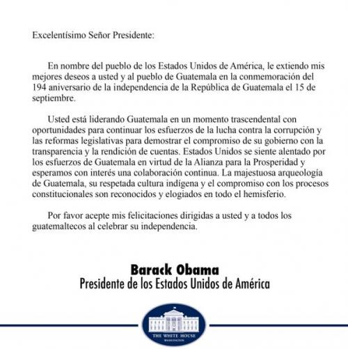 A través de su cuenta en Twitter la embajada de Estados Unidos en Guatemala publicó una carta del presidente de Estados Unidos, Barack Obama en donde envía un mensaje al presidente de Guatemala, Alejandro Maldonado con motivo de la recién pasada celebración de 194 años de independencia el 15 de Septiembre.