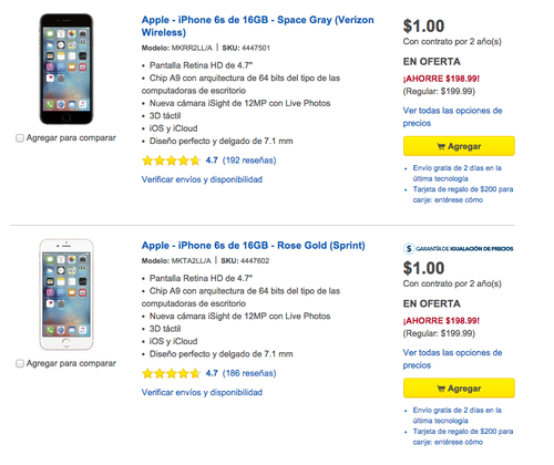 Todo aquel que desee adquirir el iPhone 6S de 16G lo puede hacer pagando únicamente un dólar. Para poder acceder a la oferta los compradores deben firmar un contrato de dos años de servicio con las empresas Verizon o Sprint, compañías de telefonía móvil.