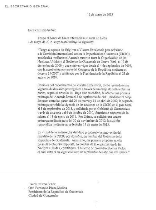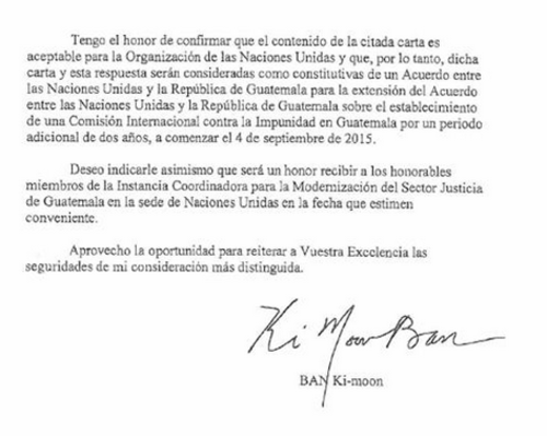 "Tengo el honor de confirmar que el contenido de la citada carta es aceptable para las Naciones Unidas (...) sobre el establecimiento de una Comisión Internacional contra la Impunidad en Guatemala por un período adicional de dos años, a comenzar el 4 de septiembre de 2015", expresa la carta.