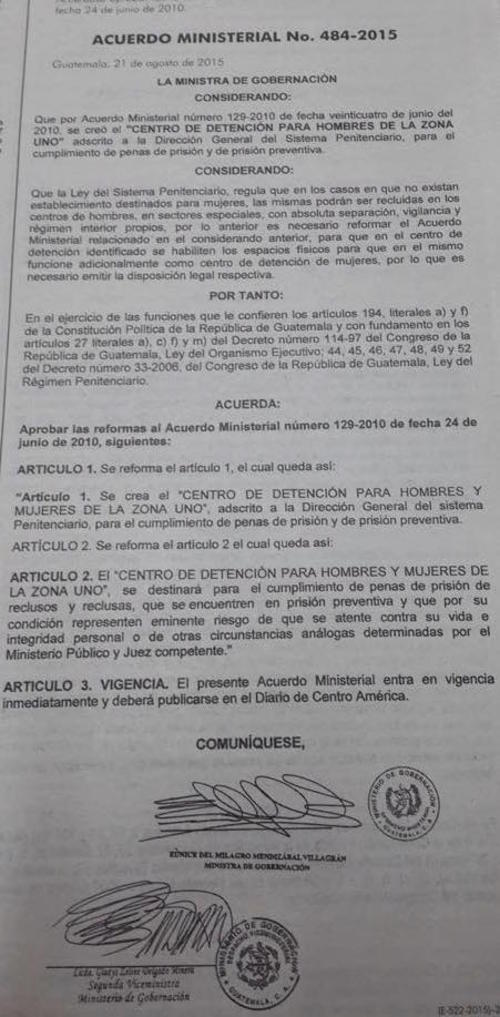 El acuerdo ministerial incluye tres reformas al acuerdo original 129-2010 del 24 de junio de 2010. Entre ellos la creación del "Centro de Detención para hombres y mujeres de la zona 1". El acuerdo entró en vigencia posteriormente a la publicación en el Diario de Centro América.