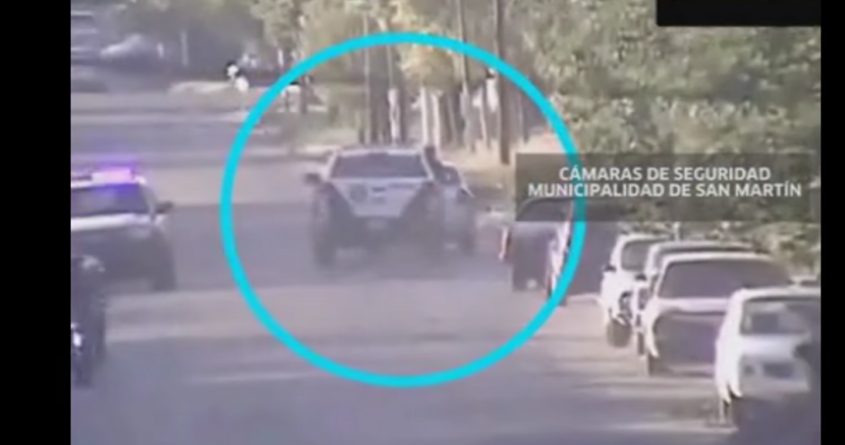 Las cámaras de seguridad de la Municipalidad de San Martín grabaron el momento de la persecución. En una de las imágenes se observa cuando los delincuentes embisten a un grupo de personas en el que estaba la mujer con su hija de siete meses de edad.