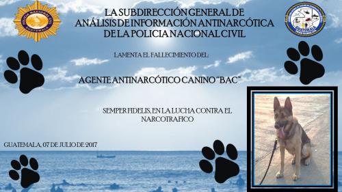 La Policía Nacional Civil (PNC) informó sobre la muerte de uno de sus agentes caninos llamado "Back", quien falleció en el cumplimiento de su deber.