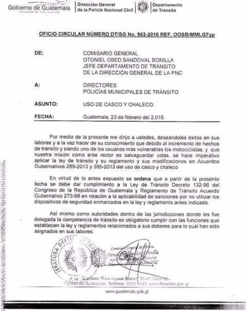 La dirección del Departamento de Tránsito de la Policía Nacional Civil ha retomado el tema de las sanciones a los motoristas que infrinjan la ley al no portar chaleco reflectivo y casco.