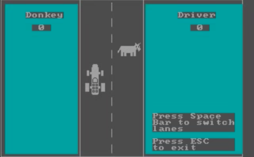 DONKEY.BAS consiste en no atropellar a un burro, si lo atropellas el burro suma un punto y si lo evitas lo suma el jugador. Conforme se avanza, el jugador conduce más arriba y el tiempo para reaccionar es menor, el control es exclusivamente con la barra espaciadora para cambiar de carril.