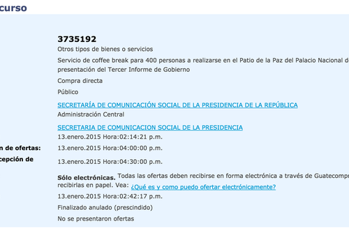 A último momento, apenas horas antes de que el gobierno presente su tercer informe de gestión, la Secretaría de Comunicación Social de la Presidencia abrió un concurso en el portal de transparencia "Guatecompras", para adjudicar un servicio de "coffee break" (bebidas y una refacción) que se serviría luego del acto. Sin embargo, éste solo permitía ofertar durante 1 hora y 46 minutos.