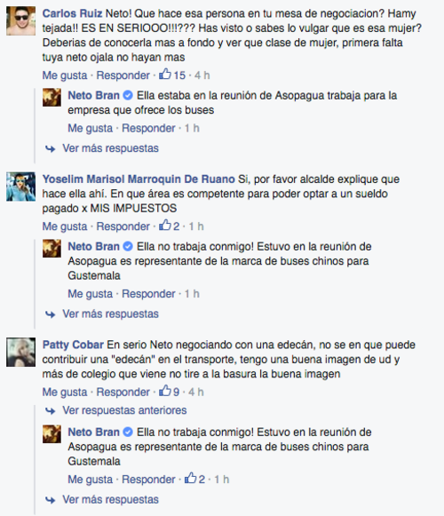 Una publicación realizada por el alcalde de Mixco Neto Bran sobre una reunión que sostuvo con representantes de la Asociación de Propietarios de Autobuses Urbanos de Guatemala (Asopagua) ha generado polémica en redes sociales, luego que en las fotografías apareciera la modelo, empresaria y exintegrante del programa televisivo "Combate", Hamy Tejeda.