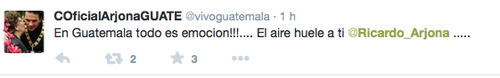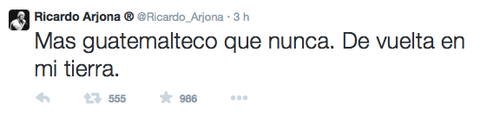 El cantautor guatemalteco Ricardo Arjona está en Guatemala, según lo anunció en su cuenta de Twitter: "Más guatemalteco que nunca. De vuelta en mi tierra", escribió a primera hora de este viernes.
