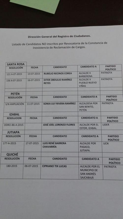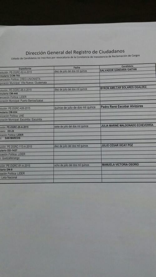 Completan el listado el candidato a alcalde de Lider en Puerto Barrios, Izabal, Byron Amílcar Solares Ogaldez, el candidato a alcalde por la UNE en Escuintla, Pedro René Escobar Alvizúres, el candidato a diputado de Lider por Quetzaltenango, Julio César Xicay Poz, la candidata al listado nacional por Lider, Manuela Victoria Osorio.