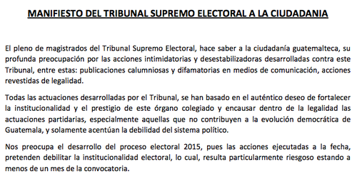 Finalmente, en el comunicado de los magistrados del TSE se puede leer que “estos actos desestabilizadores no han disminuido en ninguna forma, nuestro compromiso y decisión de cumplir con el mandato que nos confirió el pueblo de Guatemala“.