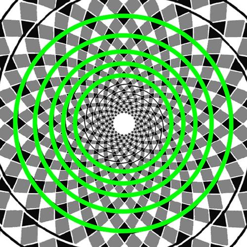 Debes fijar tu vista en el punto del centro, que cambia de color de verde a rojo. ¿Observas los puntos amarillos? ¿Todo el tiempo? si en algún momento desaparecieron de tu vista es que tuviste una ilusión óptica, los puntos amarillos siempre permanecieron allí.