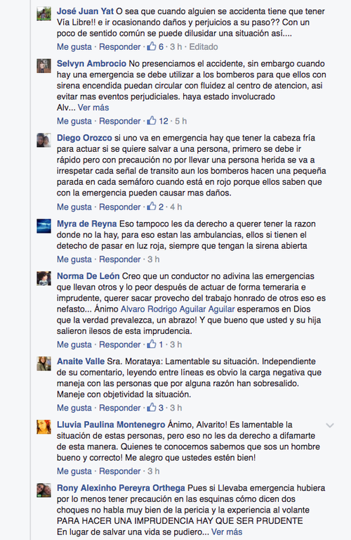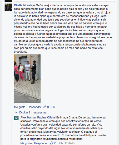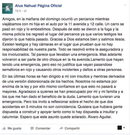 Aguilar afirma en su versión que la comitiva se pasó el semáforo en rojo, provocando un choque y huyendo luego del lugar. Luego explica que la policía regresó al lugar para solventar el hecho.