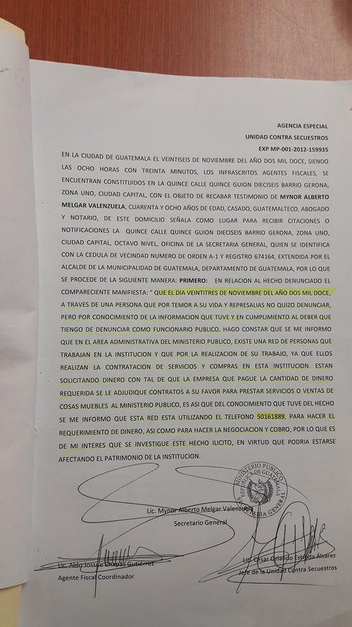 El Secretario del MP de ese entonces, Mynor Melgar, solicitó que se iniciaran las pesquisas. El funcionario afirmó haber recibido una denuncia, según la cual existía una red de empleados de la institución que cobraba sobornos por adjudicar contratos de suministros.